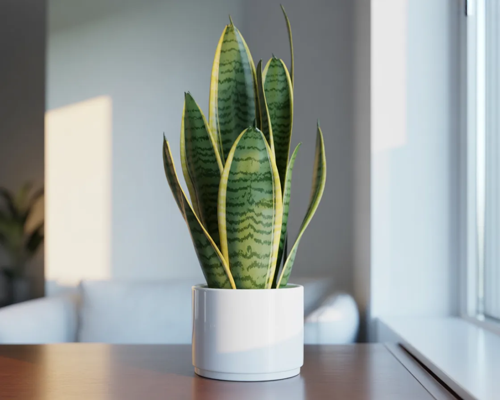 Snake Plant grows well in bedrooms and offices. It does not need daily watering. Overwatering can damage its roots. Place it near indirect sunlight for better growth. It is ideal for apartments in  big cities.