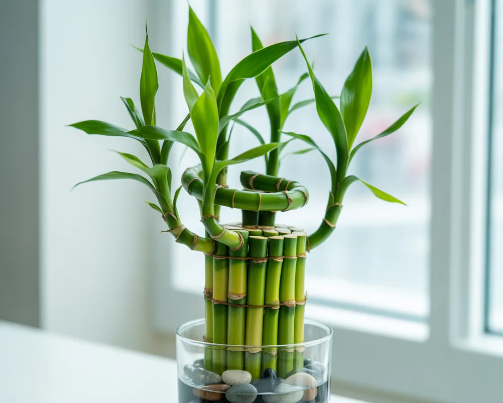 Lucky Bamboo grows in water.This plant symbolizes good fortune and prosperity. Many offices and retail stores keep it for decoration and to attract positive energy. To stay healthy, it requires clean water and bright, indirect light.