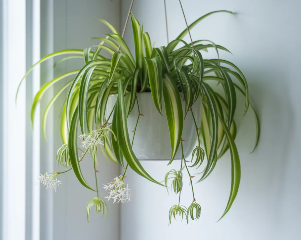 The Spider Plant features long, narrow green leaves decorated with attractive white stripes. It produces baby plants that hang beautifully. It is one of the most affordable indoor plants in Pakistan.